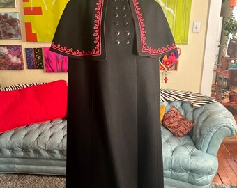 Thrifted metal buttons and decorative nordic ribbon around sleeves. Super heavy woolpolyester coat. Look like you favourite movie star in your own Sherlock Holmes Inverness Coat.